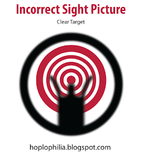 During aiming, the shooter usually shifts focus between the rear sight (to ensure proper sight alignment), the front sight post (for proper sight picture), and the target (to observe additional threats or results from previous shots). Depending on the role and environment, the shooter may need to focus more downrange, but the optimum sight picture requires the shooter to focus on the front sight, known as a clear front sight tip. If the shooter is focusing on the target, there is a larger margin error due to the inherent blur of the out-of-focus front sight.