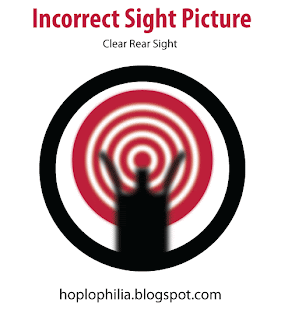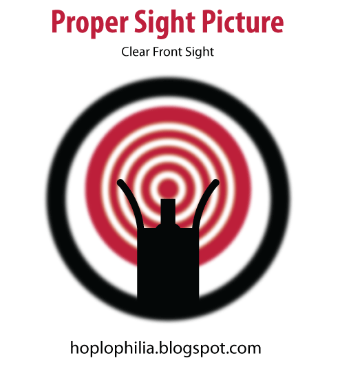 Sight picture is the placement of properly aligned sights on the target as well as the point of focus. The top of front sight is placed either centered on the target, known as center mass, or placed tangent to the bottom of the target, known as six o'clock hold or the lollipop method. The latter six o'clock hold method is usually preferred as it provides the most consistent sight picture.